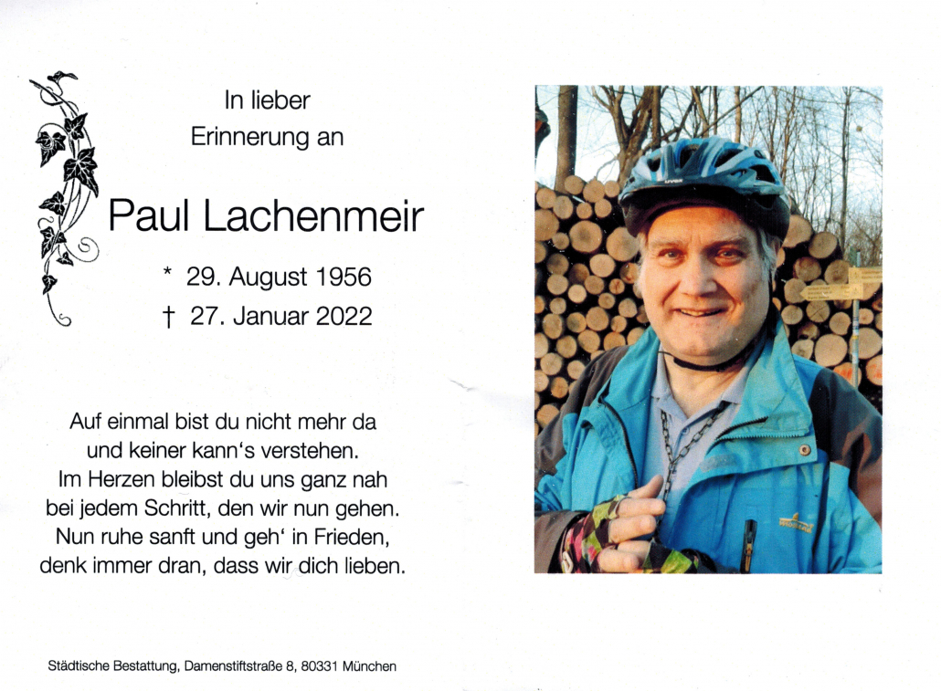 Liebe Vereinsmitglieder, mit tiefer Trauer und Betroffenheit haben wir die Nachricht vernommen, dass unser ehemaliger Vorstand und langjähriges Vereinsmitglied Paul Lachenmeir im Alter von 65 Jahren am 27.01.22 verstorben ist. Wir bedauern diesen Verlust zutiefst und sprechen der gesamten Familie Lachenmeir sowie allen Angehörigen und Freunden unser aufrichtiges Mitgefühl aus. Paul war 45 Jahre Mitglied im Verein und langjähriger Vorstand des Süddeutschen Tauchclub. Für seine unermüdliche Arbeit im Verein sind wir ihm sehr dankbar. Unvergesslich sind seine Vereinsausflüge ans Mittelmeer und seine Tauchertaufen. Viele Mitglieder haben bei ihm ihren Tauchschein gemacht und schätzten seine ruhige und geduldige Art und werden ihn dankbar und mit einem Lächeln in Erinnerung halten. Als langjähriger Präsident des BLTV war er eine Institution, der den Tauchsport in Bayern entscheidend vorangebracht hat. In Dankbarkeit und tiefer Anteilnahme die Vorstandschaft des Süddeutschen Tauchclubs