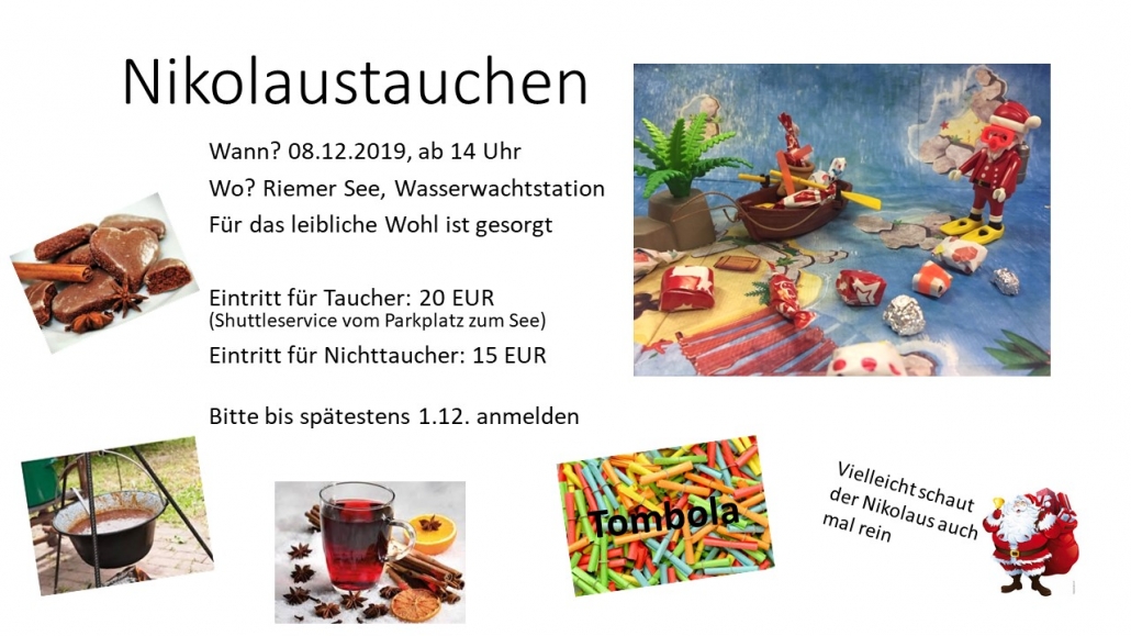 Liebe Tauchsport- und Weihnachtsbegeisterte, das Jahr neigt sich dem Ende zu, die Tauchsaison ist fast vorbei. Ein herrliches Projekt zum Jahresausklang ist ein Nikolaustauchen. Dort können Trockentaucher den Riemer See betauchen (es gibt sogar einen Shuttle-Service) oder Nass- und Landtaucher einen geselligen Nachmittag mit anderen Tauchverrückten verbringen. Es gibt Spannung, Überraschung, Verpflegung und eine Tombola. Durchgeführt wird das Ganze von ABC-Divers in Eching. als Veranstalter Bei Interesse bitte direkt dort anmelden. Biba und ich sind schon mal angemeldet. Gut Luft und viel Spaß Gerhard