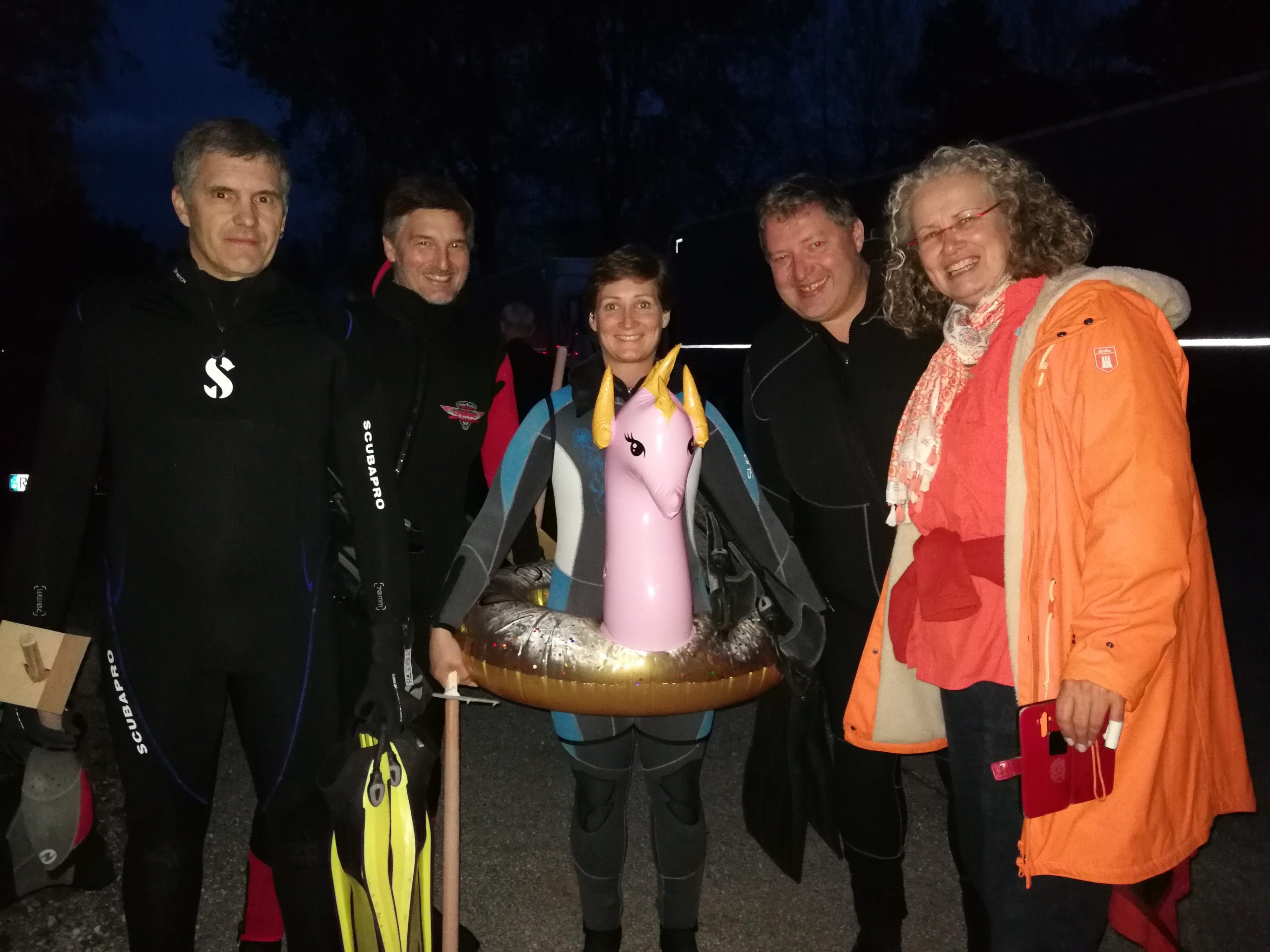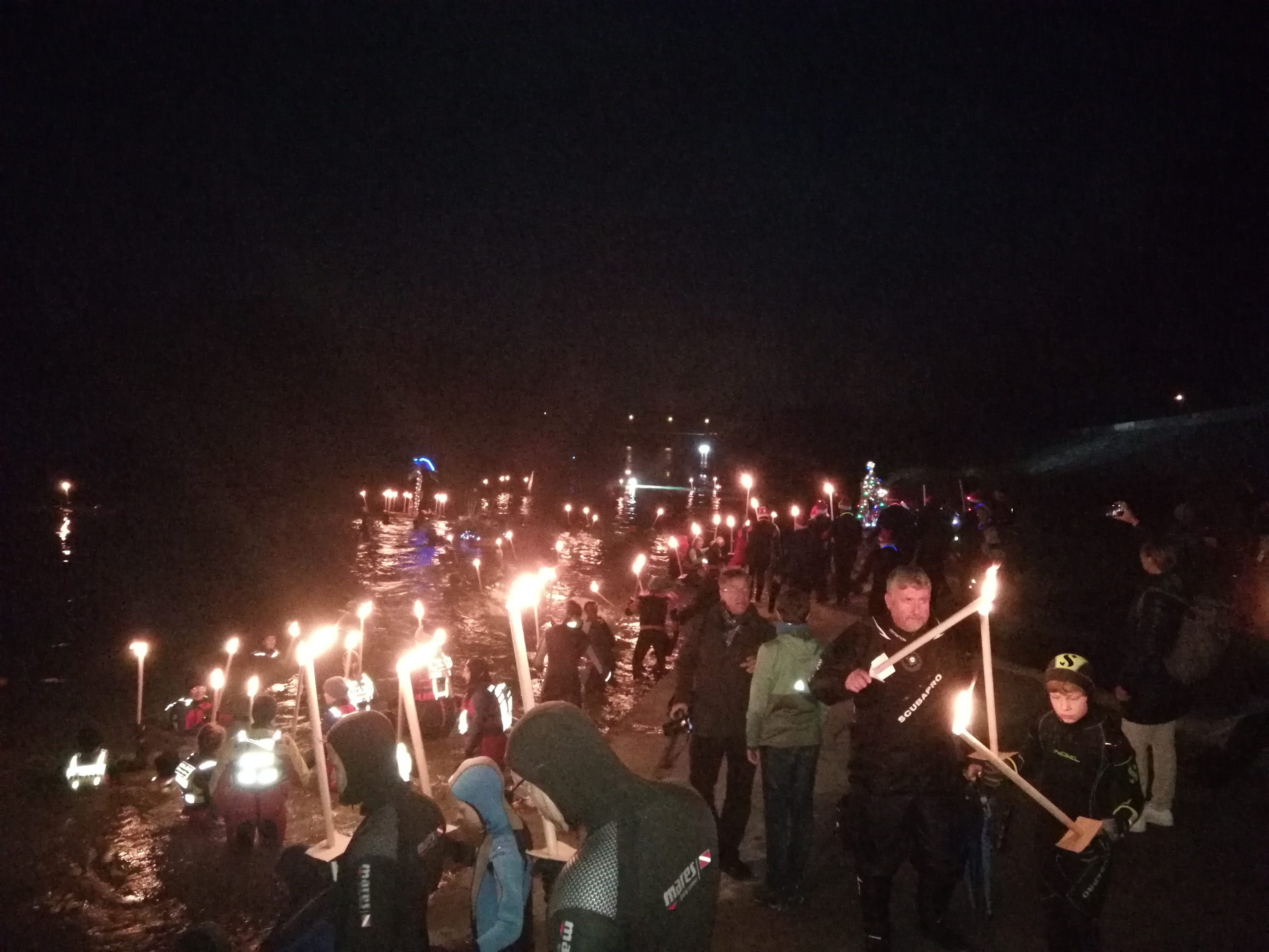 wir waren Gast bei unseren Freunden vom Tauchclub Octopus Rosenheim zu deren jährlichen Fackelschwimmen. 105 Teilnehmer gingen an den Start und auch alle kamen wohlbehalten wieder zu Hause an, obwohl manche Teilnehmer wohl zwischendurch in fremde Autos eingestiegen waren. Merke: Was beim Fackelschwimmen passiert bleibt beim Fackelschwimmen. Und so soll nun auch der gnädige Vorhang des Vergessens über diese Begebenheit gezogen werden. Man muss nicht alles breittreten und endlos diskutieren – wobei lustig war’s schon.