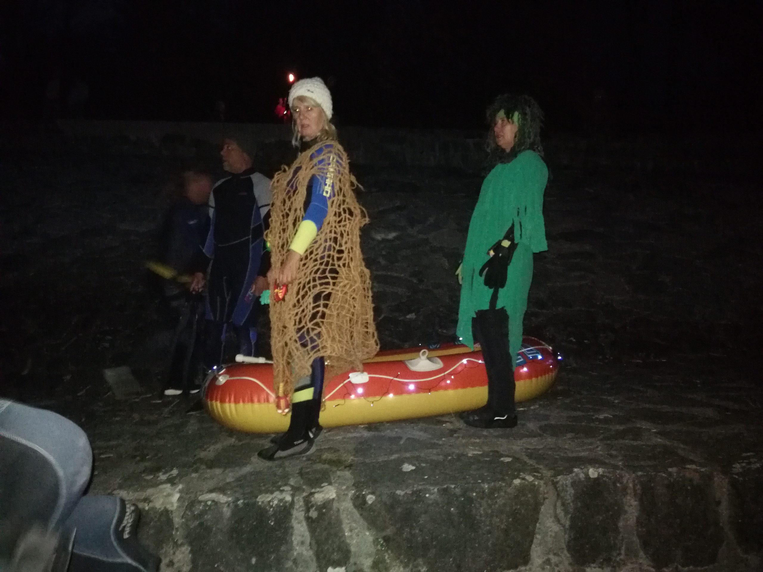 Wie auch immer, wir hatten eine Riesengaudi. Nach unseren Vorbereitungen mit einem kleinen Seepferdchen als Vereinsmaskottchen gingen Katharina, Andreas, Gerhard und Manni ins gar nicht mal so kalte Wasser, Biba blieb als Helfer am Ufer zurück. Viele Vereine nahmen teil und hatten teilweise sehr schöne und aufwändige Gefährte am Start. Andernfalls hätten sich die Unmengen Kinderpunsch gar nicht transportieren lassen, die unterwegs getrunken wurden. Eigentlich ging es auf dem Fluss ruhig dahin, wenn es aber unter Brücken durchging, merkte man, dass wir ziemlich flott unterwegs waren.