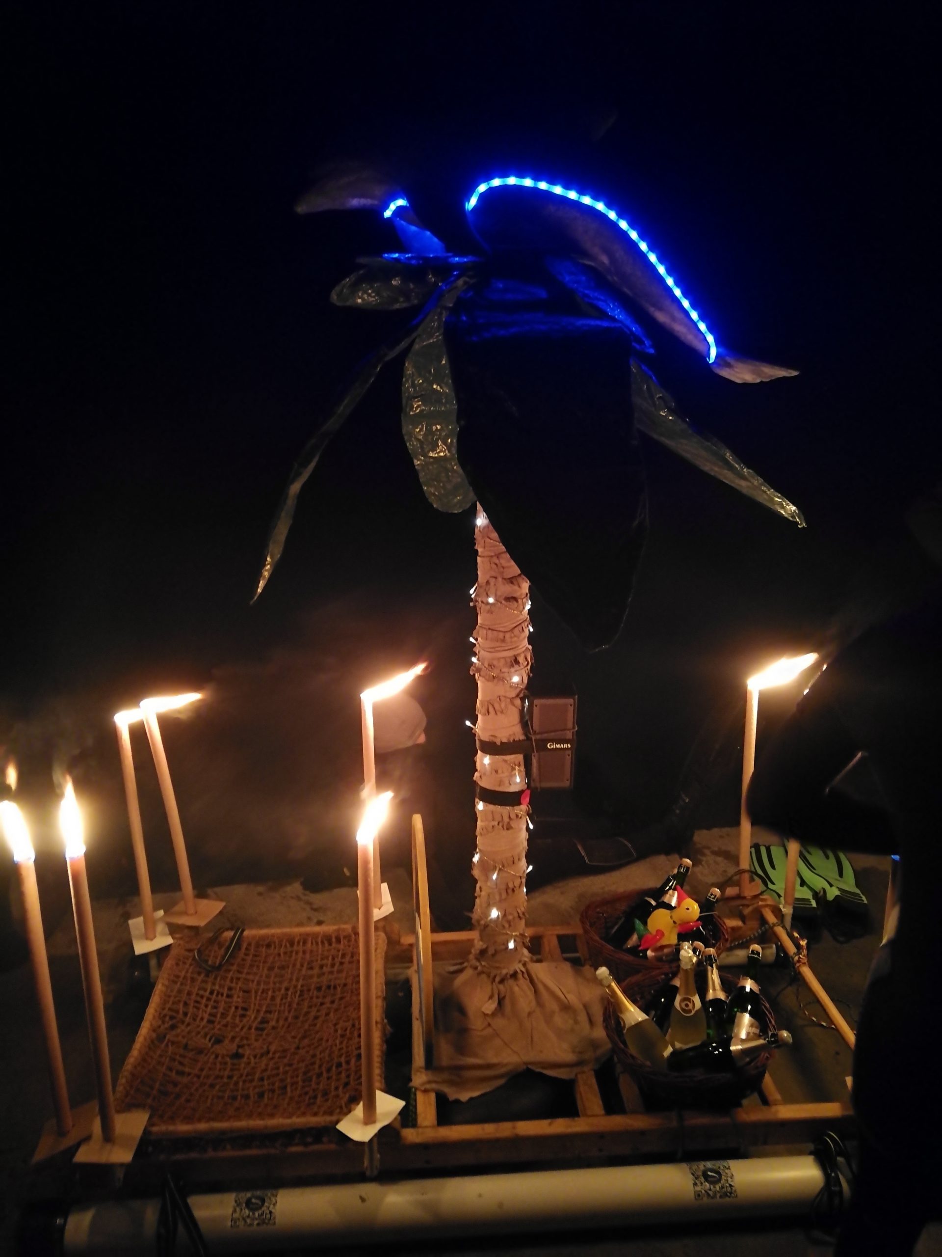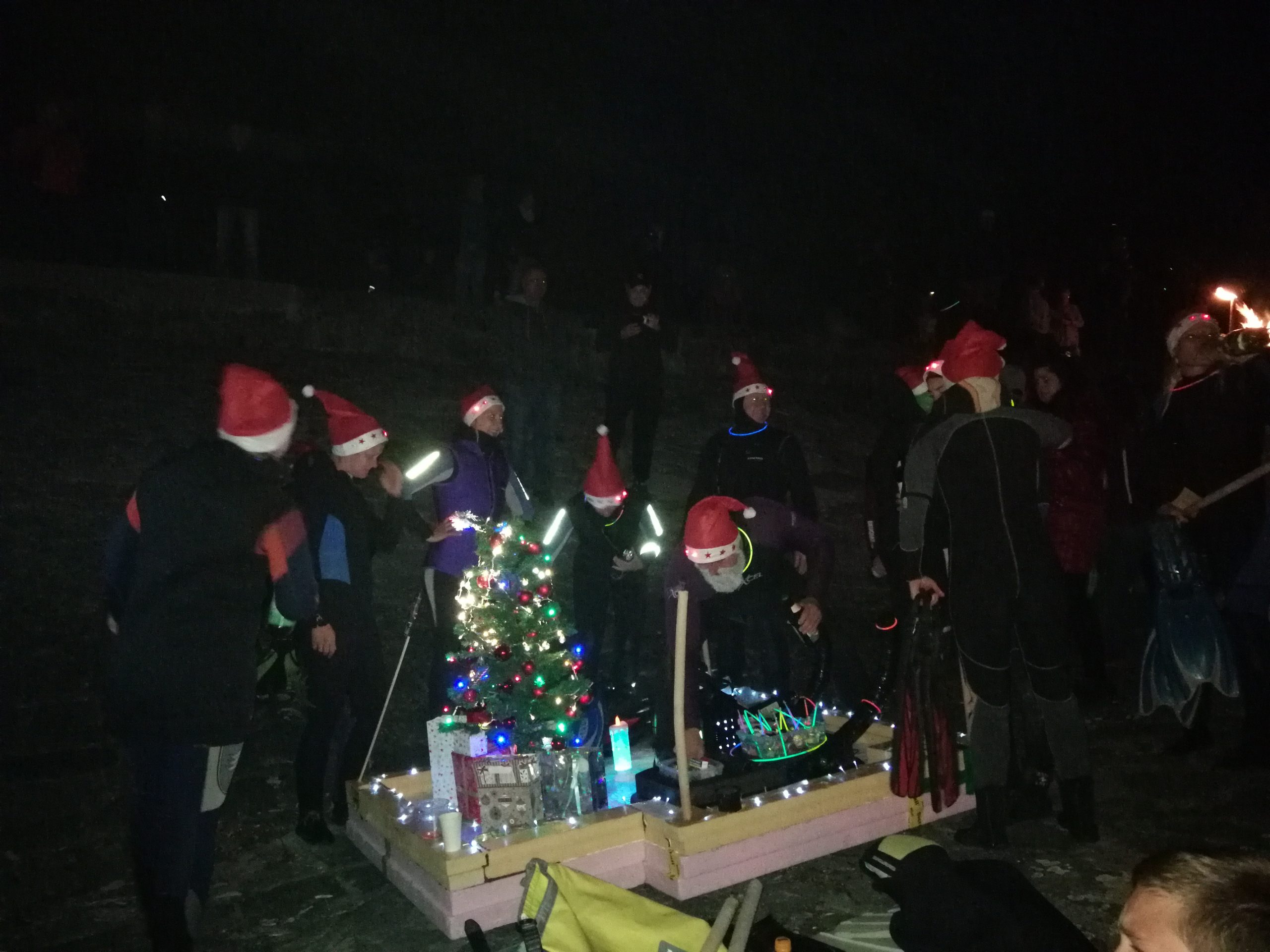 Bei der Anlandung musste man relativ entschlossen versuchen das Ufer zu erklimmen. Obwohl nach dem Anlanden sicher niemand mehr durstig war, gab es Punsch und auch ein riesen Feuer zum Aufwärmen. Die trockenen Klamotten standen nach der Dusche schon bereit und es ging zurück mit einem Shuttle-Service zu den Feierlichkeiten.