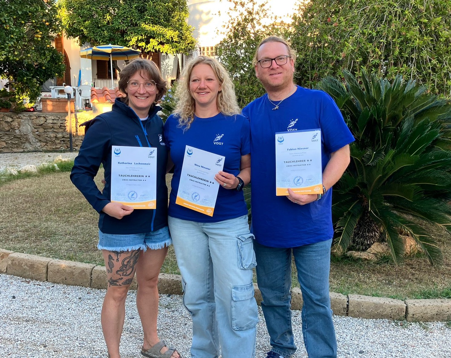 Liebe Wasserbegeisterte, soeben erreicht uns die Meldung, dass unser Sebastian und unser Manni die Tauchlehrerprüfung in Sveta Marina bestanden haben und fürderhin die Tauchlehrer-1-Lizenz tragen. Wir freuen uns sehr über den Zuwachs in unserer Ausbildermannschaft. Herzlichen Glückwunsch Euch beiden, allzeit gut Luft und viele artige Tauchschüler wünscht Euch Euer Verein